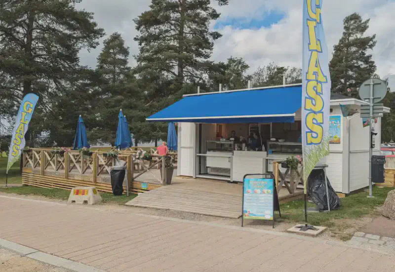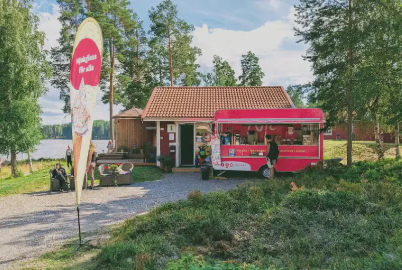 Vid en gullig liten kiosk kan man bl a köpa sig en glass, lite godis eller en bubbelvåffla med gott innehåll. 😊