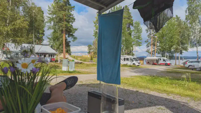 En ganska trivsam camping med väl tilltagna platser, hade dock önskat att de var lite mer jämna, men men man kan inte få allt och det är väl tur att klossarna gick komma till användning. 😊